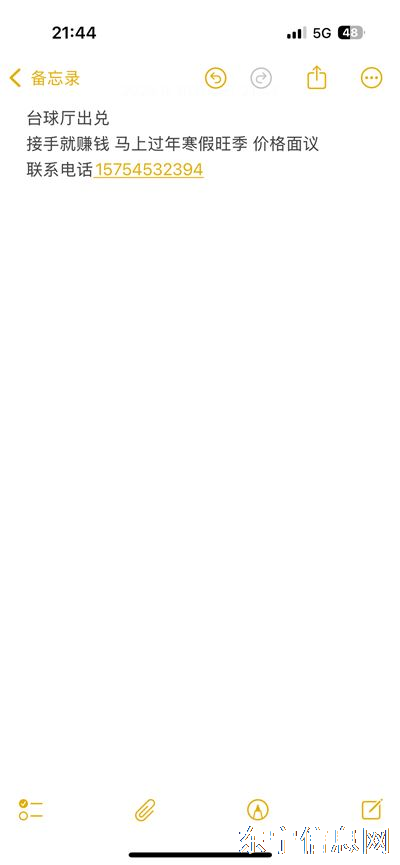 台球厅出兑 接手就赚钱 马上过年寒假旺季 价格面议 联系电话15754532394